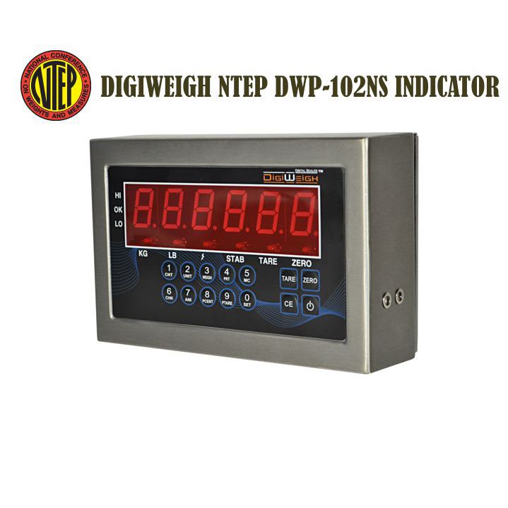 The DIGIWEIGH DWP-102NS Stainless steel weighing indicator is an NTEP approved ( 6000 divisions ) easy to use indicator which can be used with floor scales, bench scales, pallet truck scales, forklift scales and other scales.